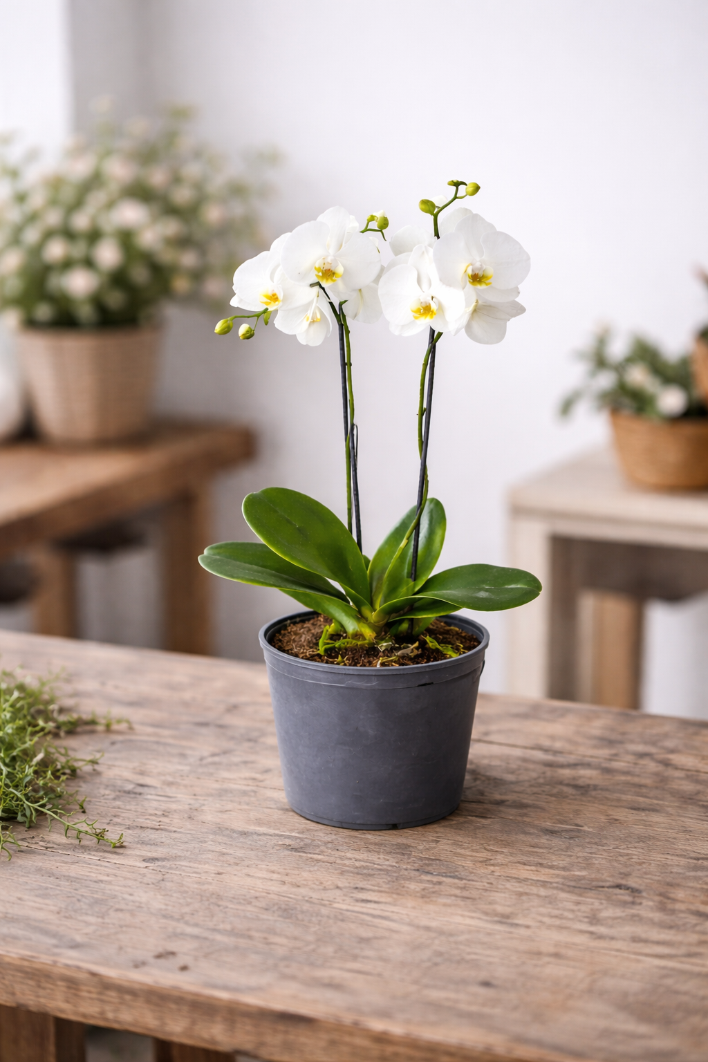 Delicada, intemporal e cheia de significado, esta orquídea branca é a escolha perfeita para quem valoriza beleza natural com um toque de sofisticação. As suas flores brancas simbolizam pureza, serenidade e elegância, tornando-a ideal para oferecer ou para elevar qualquer espaço da casa ou do escritório.