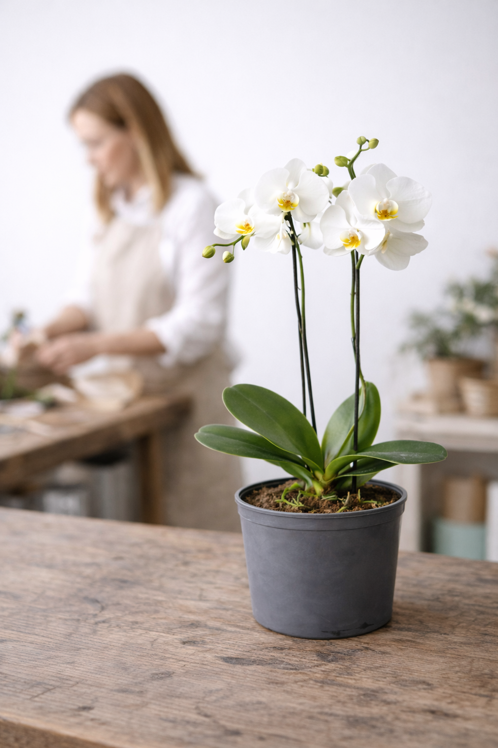 Apresentada num vaso cinza de linhas simples, esta orquídea integra-se facilmente em ambientes modernos ou clássicos, sendo um presente duradouro que continua a florescer com os cuidados certos.